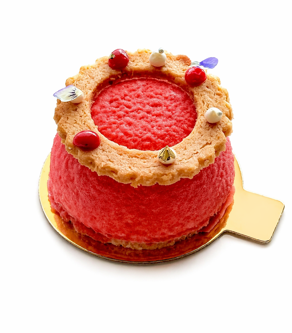 Strawberry and raspberry sponge layered with slow-cooked berry jam and light strawberry mousse, coated in snappy chocolate and finished with a delicate biscuit crown. (free from gluten, dairy and nuts)