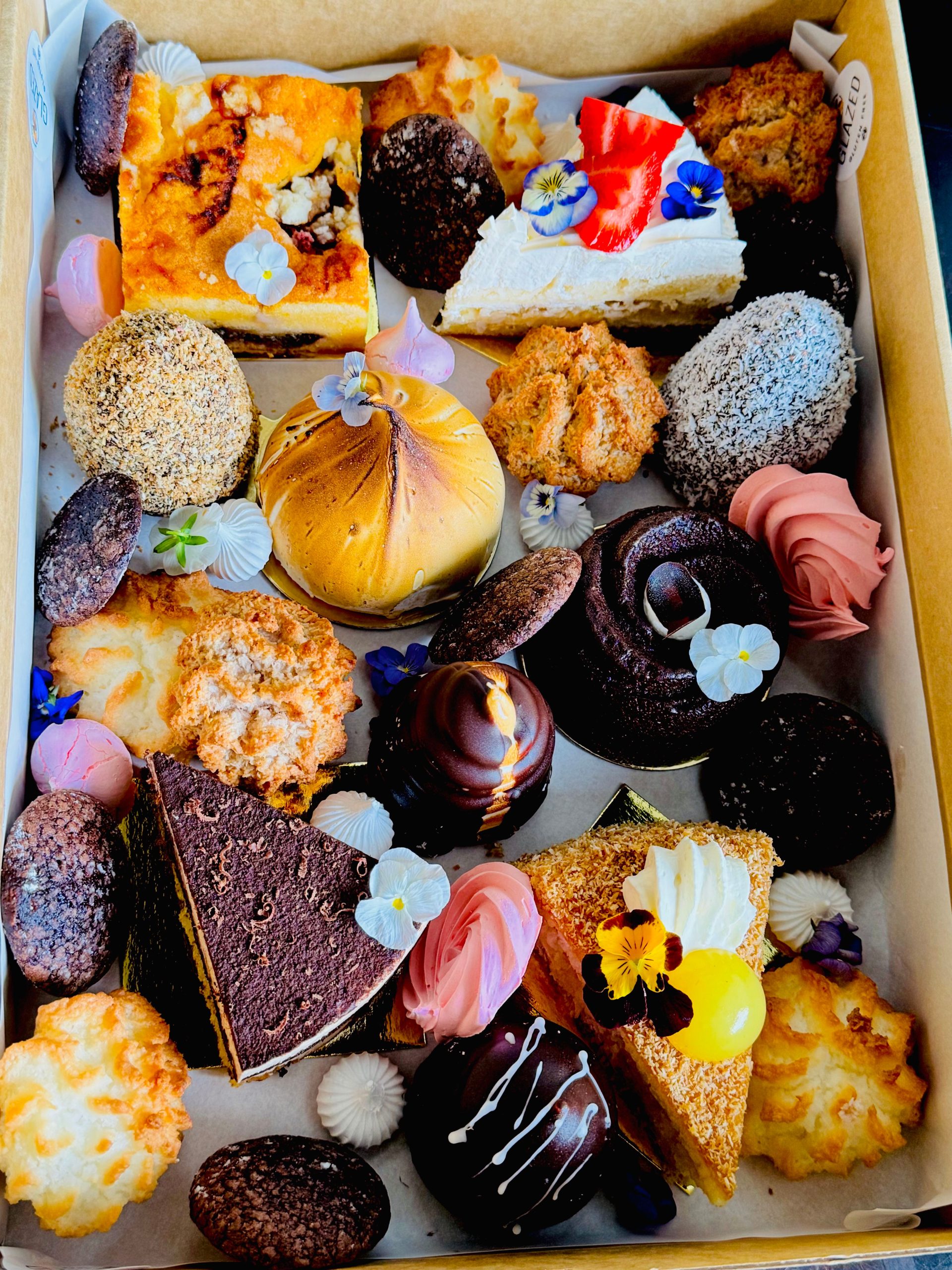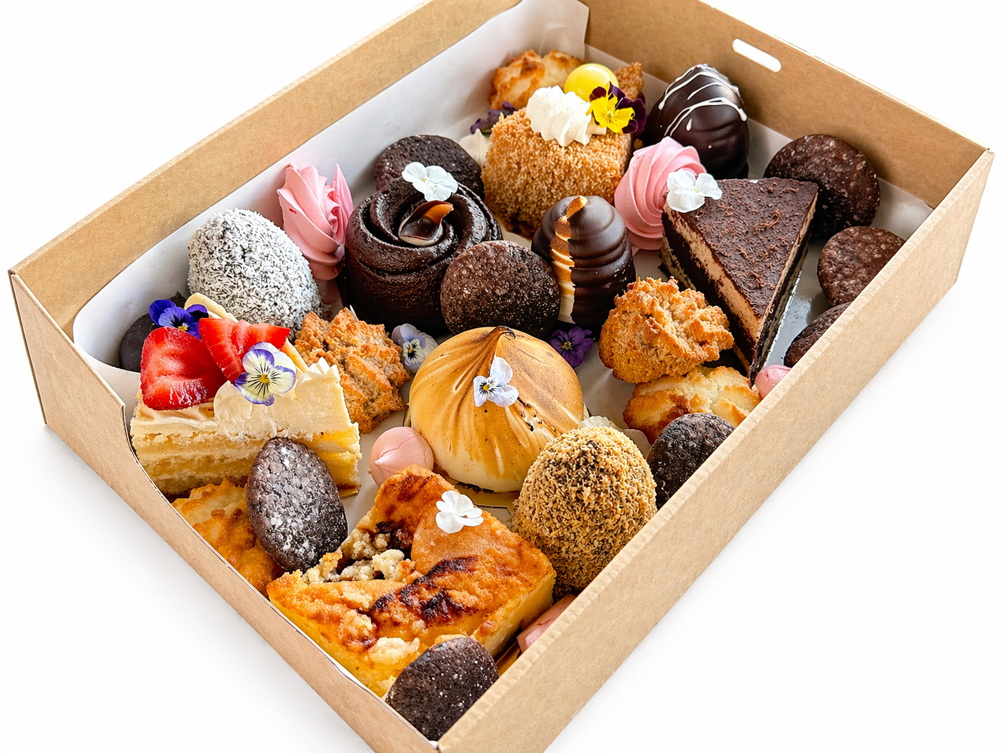 This specialty tailored box includes 6 assorted desserts handpicked by Chef Liran, 4 signature krembo, meringues and mini treats, chocolate plaque, presented in a clear-top dessert box, designed for an elegant and indulgent experience.