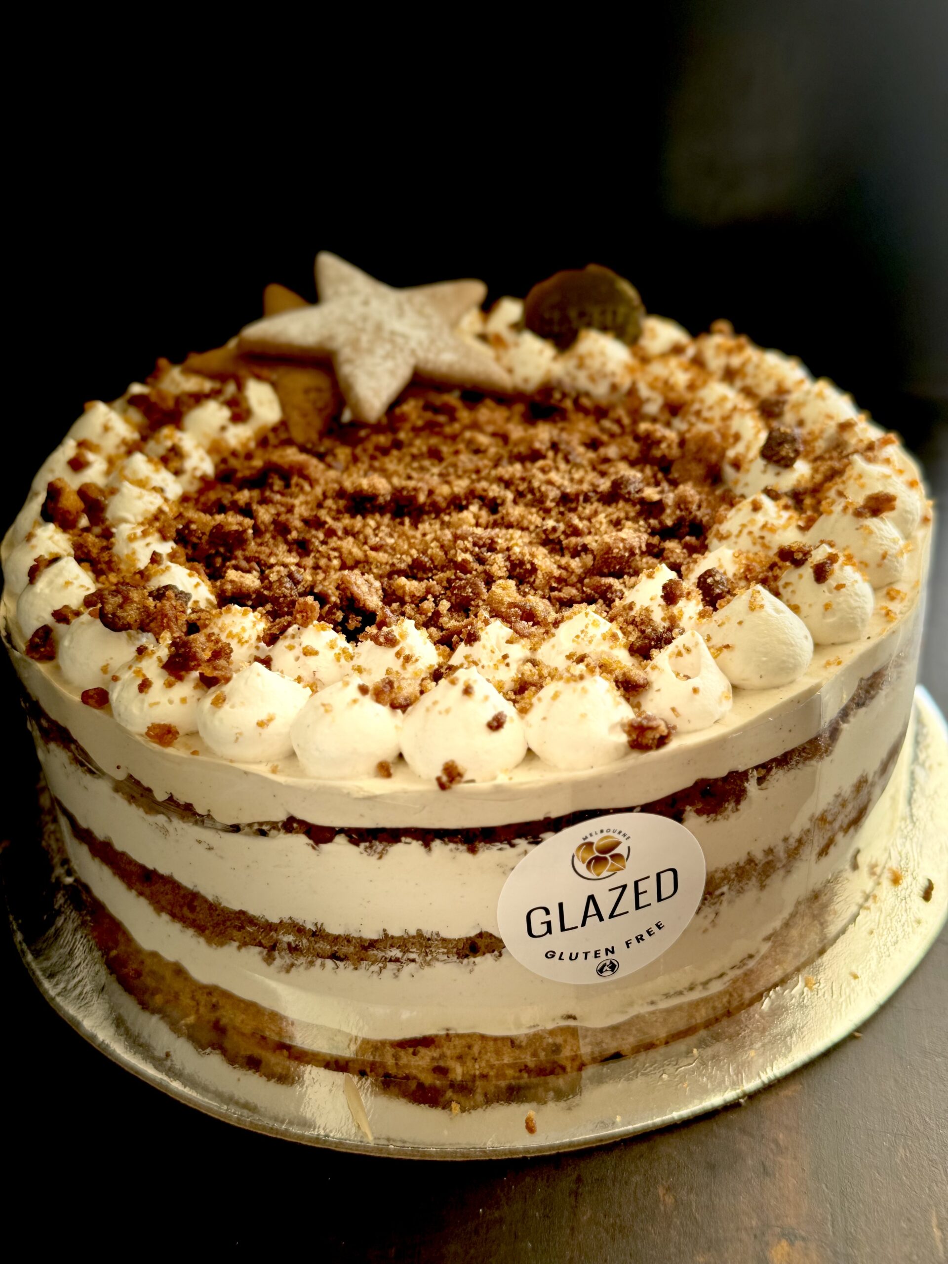 Silky mixed spice ginger crèmeux paired with a soft honey cinnamon ginger sponge. 7″ (Free from gluten, dairy, nuts)