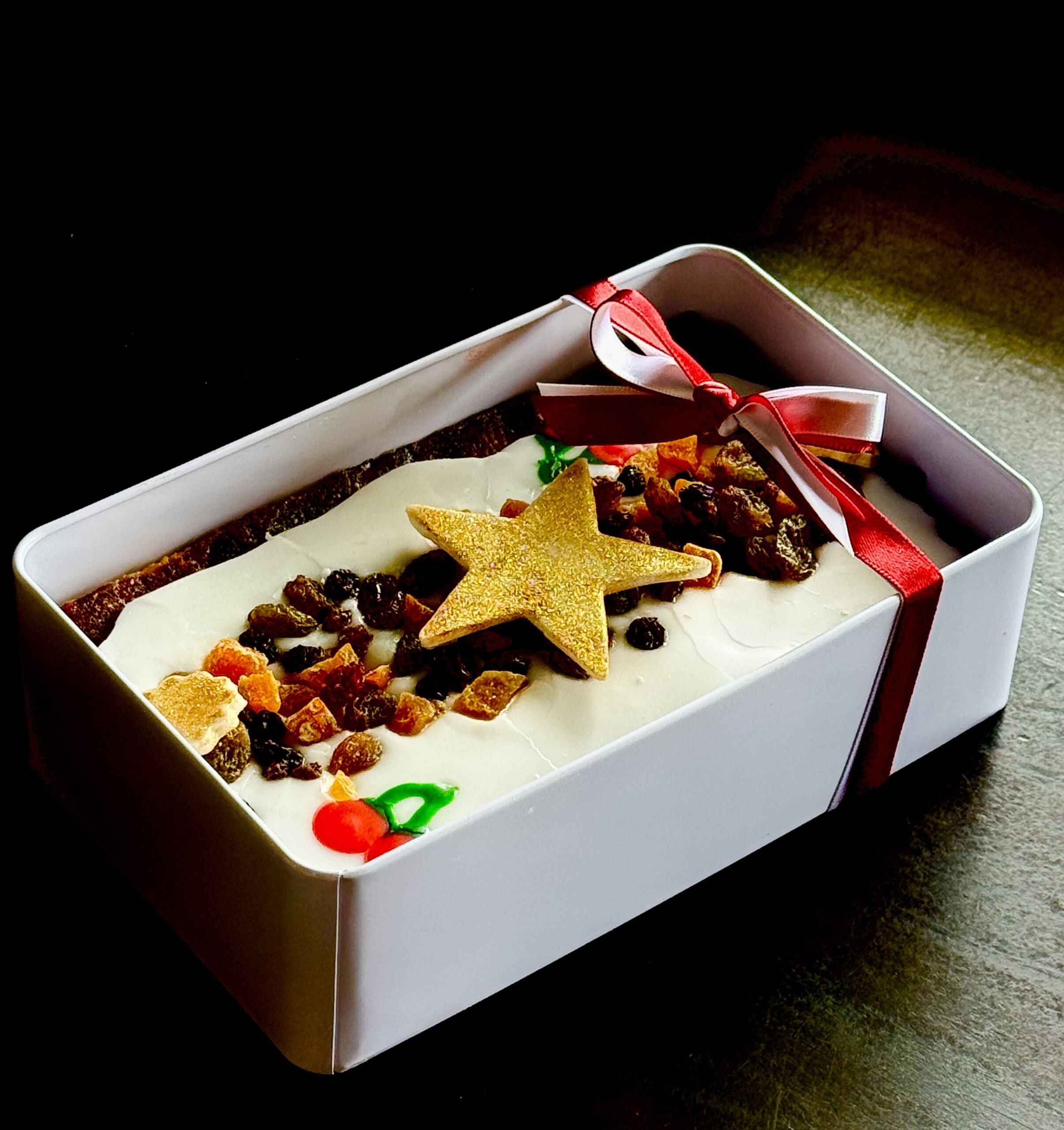 A decadent, rich fruit cake crafted with an abundance of premium plum vine fruits, lovingly soaked in rum and spices until luxuriously tender. Moist, dense and beautifully sticky, complete with beautiful handmade decoration. Presented in an elegant tin, it’s ready to gift, share and savour. (Free from gluten, dairy, nuts)