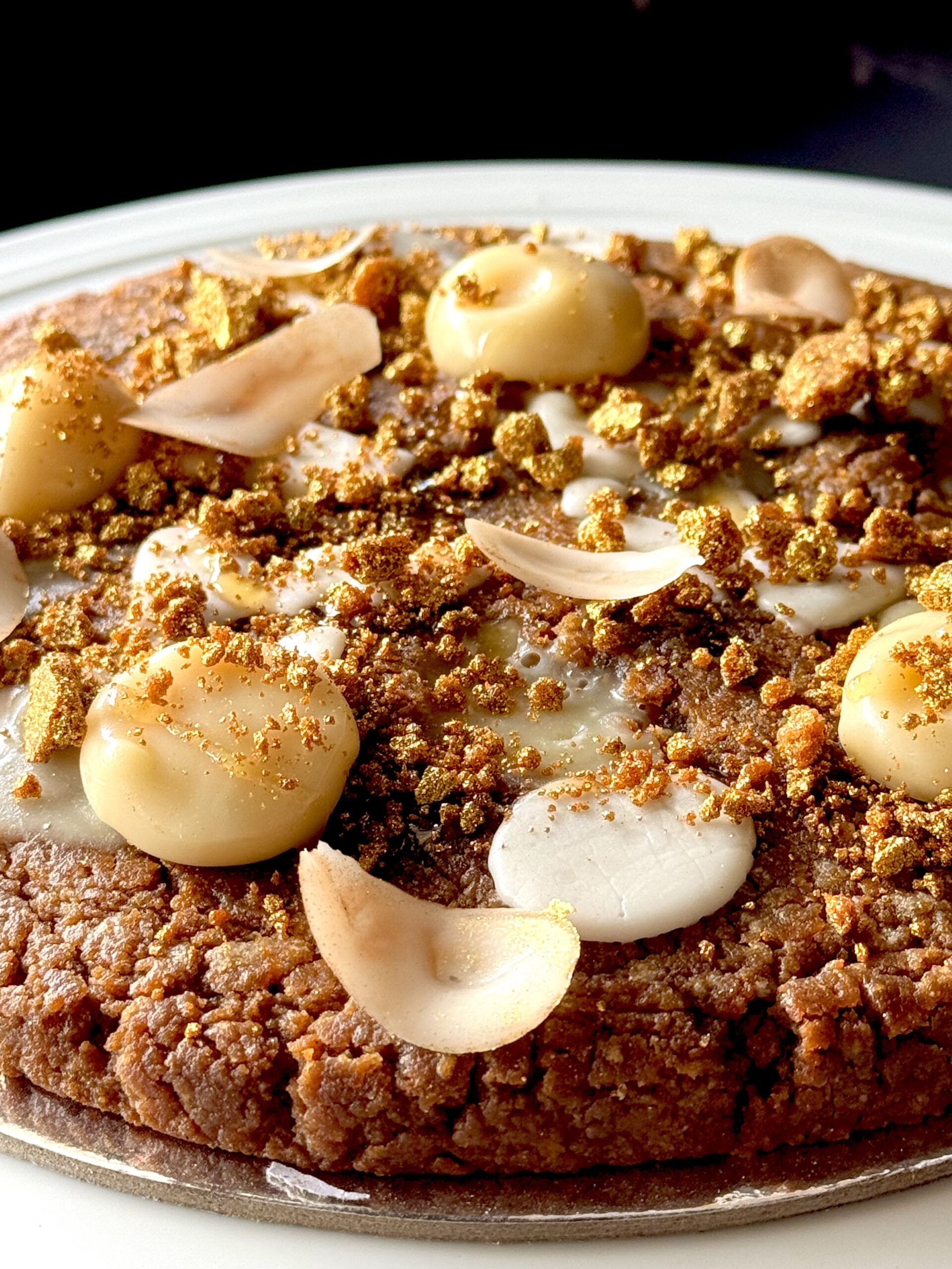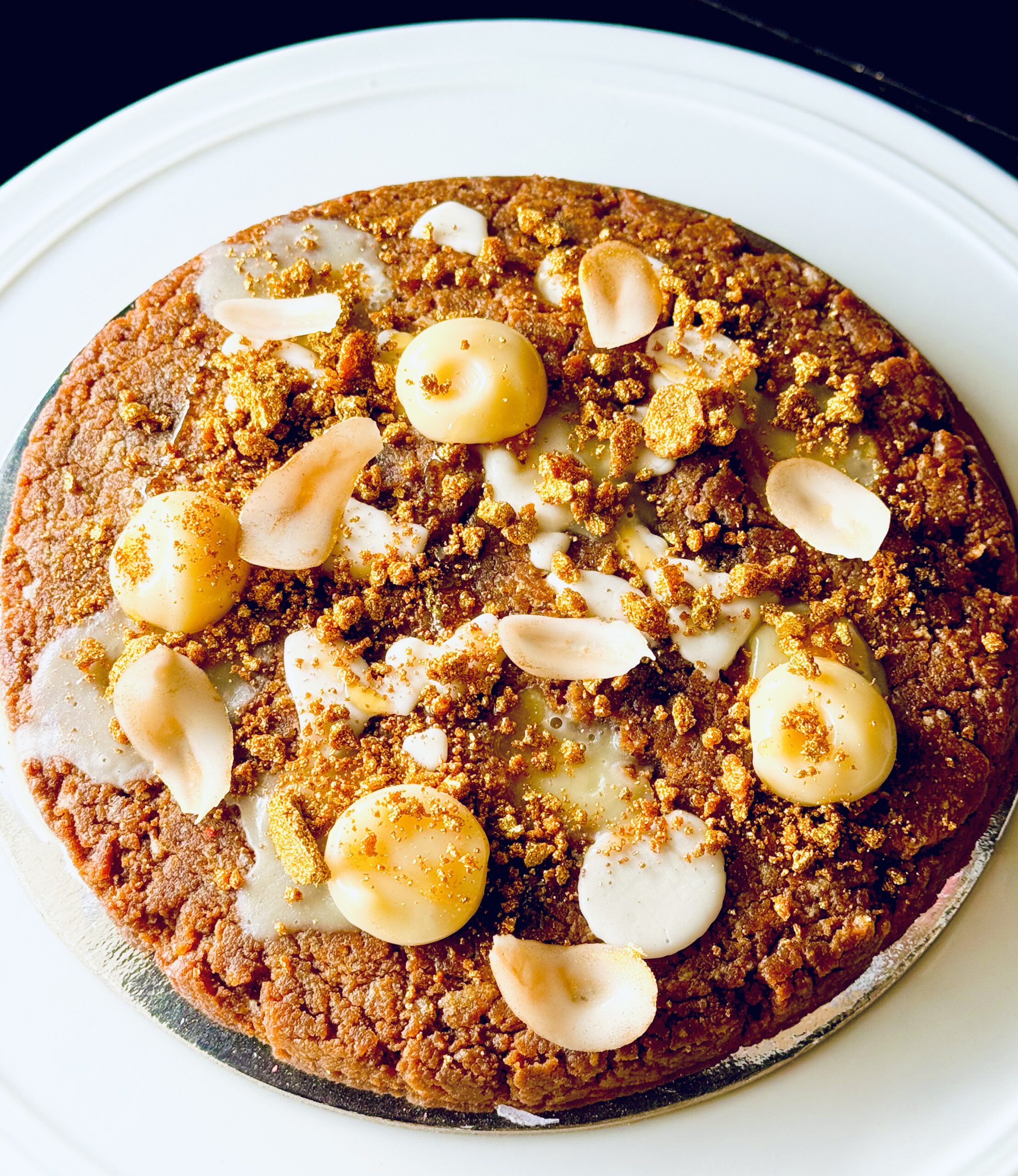 This golden cookie cake is layered with silky honey ganache and sprinkled with buttery cinnamon crumble for the perfect balance of texture and sweetness. Crunchy on the outside, soft on the inside. 7″ (free from gluten, dairy and nuts)
