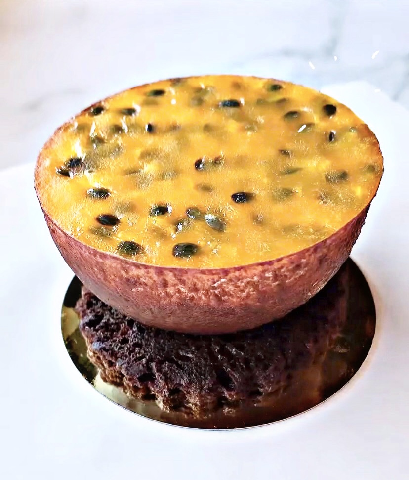 Passionfruit infused with lemongrass mousse on dacquoise disk. ( free from gluten, dairy and nuts )