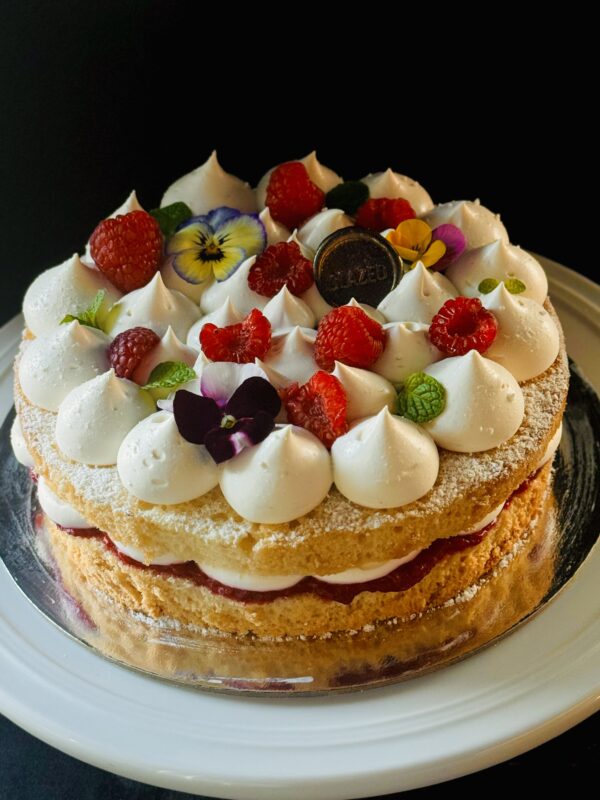 Layers of soft sponge cake with housemade strawberry confit, filled with luscious vanilla chantilly cream and bursting with fresh, juicy seasonal fresh fruits. 7″ (Free from gluten, dairy, nuts)